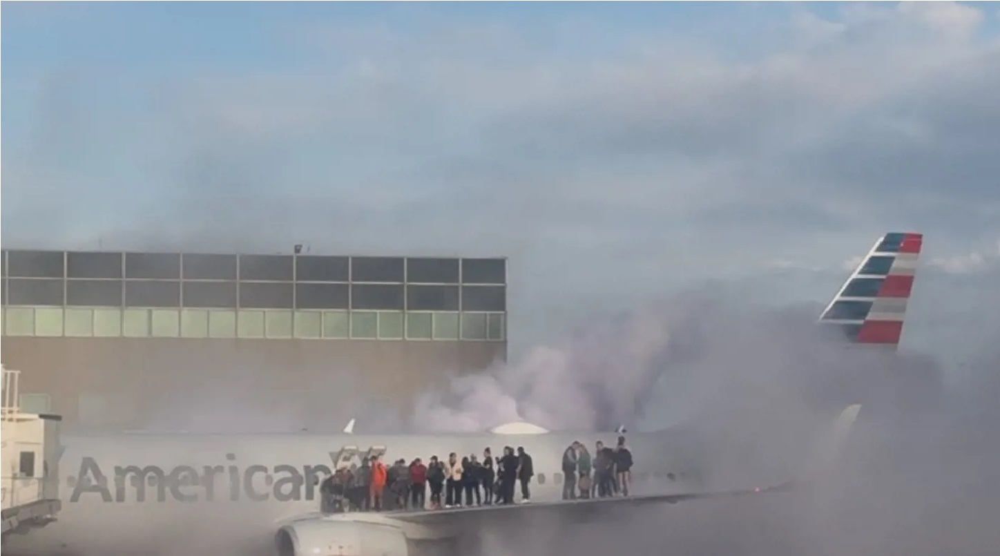 وأظهرت الصور الطائرة وقد غلفها الدخان وركابا يقفون على أحد جناحيها في انتظار المساعدة.