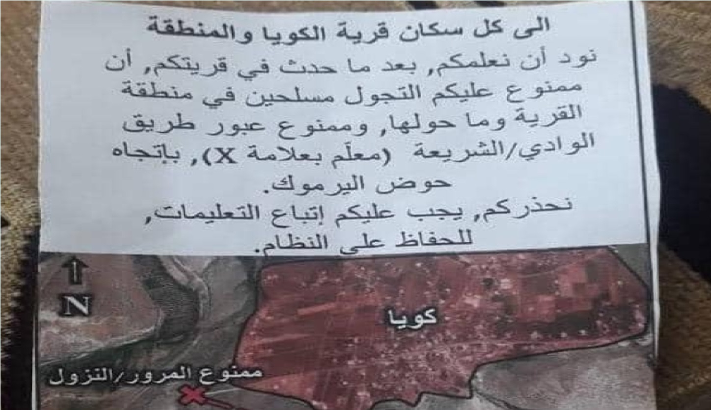 في تطور آخر، ألقت القوات الإسرائيلية منشورات ورقية على قرية كويا بريف درعا، حذرت فيها السكان من استخدام طريق الوادي-الشريعة. وجاء في مضمون المنشورات: "إلى كل سكان قرية كويا والمنطقة، نود أن نعلمكم أنه بعد ما حدث في قريتكم، يُمنع عليكم التجول مسلحين في منطقة القرية وما حولها، كما يُمنع عبور طريق الوادي- الشريعة، الذي يتضمن علامة X باتجاه حوض اليرموك. نحذّركم، وعليكم اتباع التعليمات للحفاظ على النظام."