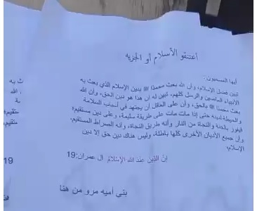 عُثر صباح أمس على ملصق دعوي يحمل خطابًا دينيًا إقصائيًا على جدار الكنيسة المارونية في مدينة طرطوس، يدعو أبناء الديانة المسيحية إلى اعتناق الإسلام أو دفع الجزية، ويتضمن عبارات ترفض الأديان الأخرى وتعتبرها باطلة، مع توقيع غامض يشير إلى عبارة "بني أمية مرّوا من هنا".