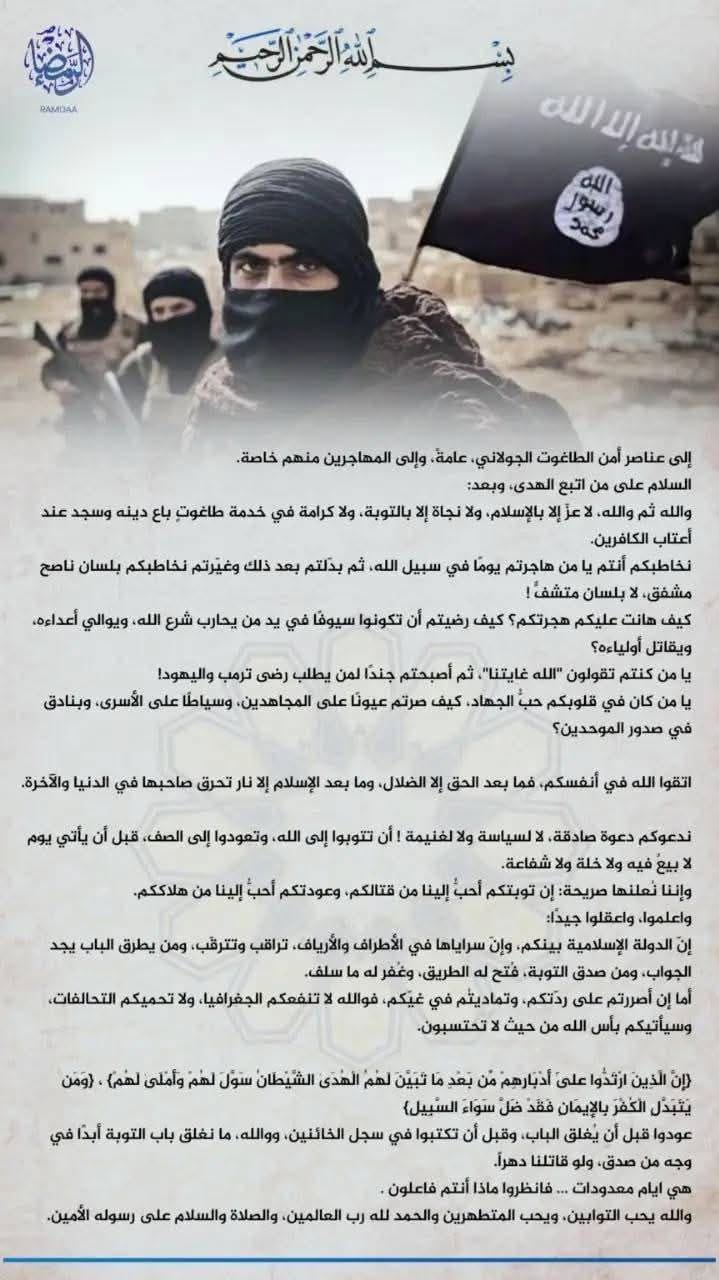 في تطور جديد يعكس تصاعد لهجة الخطاب الدعائي، أطلق تنظيم متشدد رسالة تحريضية حملت طابعًا دينيًا وعاطفيًا، وجهها إلى من وصفهم بـ"المنشقين" و"الضالين"، في إشارة إلى أفراد انضموا إلى جهات عسكرية معارضة له في مناطق النفوذ شمال سوريا. الرسالة جاءت ضمن حملة إعلامية هدفها استقطاب العناصر المترددة، وإعادة تعبئة صفوف التنظيم بعد سنوات من التراجع.