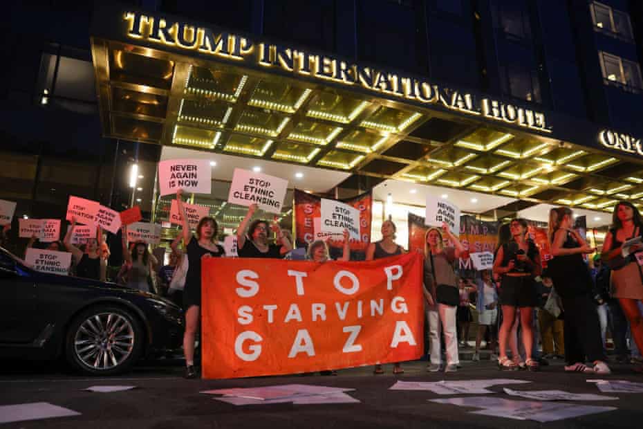 ورفع المحتجون لافتات كُتب عليها "ليس باسمنا"، و"أوقفوا التطهير العرقي"، و"ترامب: اليهود يقولون كفى"، فيما جلس العشرات في الشارع أمام الفندق، مرددين هتافات تطالب بإنهاء الحرب وتكثيف المساعدات الإنسانية لقطاع غزة الذي يعيش كارثة إنسانية منذ أشهر.